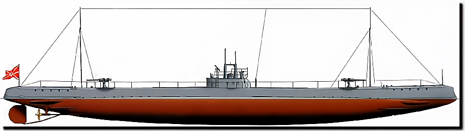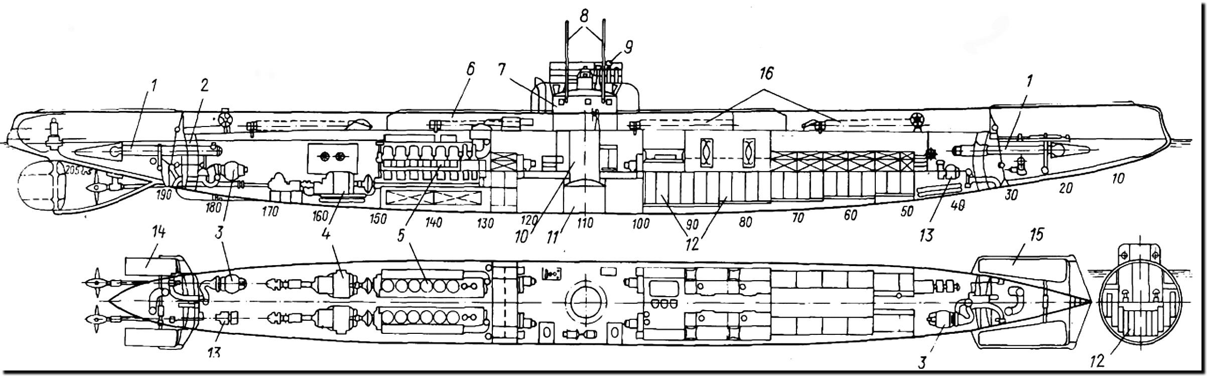 1.- tubes lance-torpilles de 45 cm 2.- caisse d'assiette arrière 3.- pompe centrifuge 4.- moteur électrique de propulsion 5.- moteur Diesel 6.- caisse de pont 7.- kiosque 8.- périscopes Hertz 9.- habitacle du compas 10.- caisse de réglage 11.- caisse complémentaire 12.- batterie 13.- compresseur électrique 14.- barre de plongée arrière 15.- barre de plongée avant |