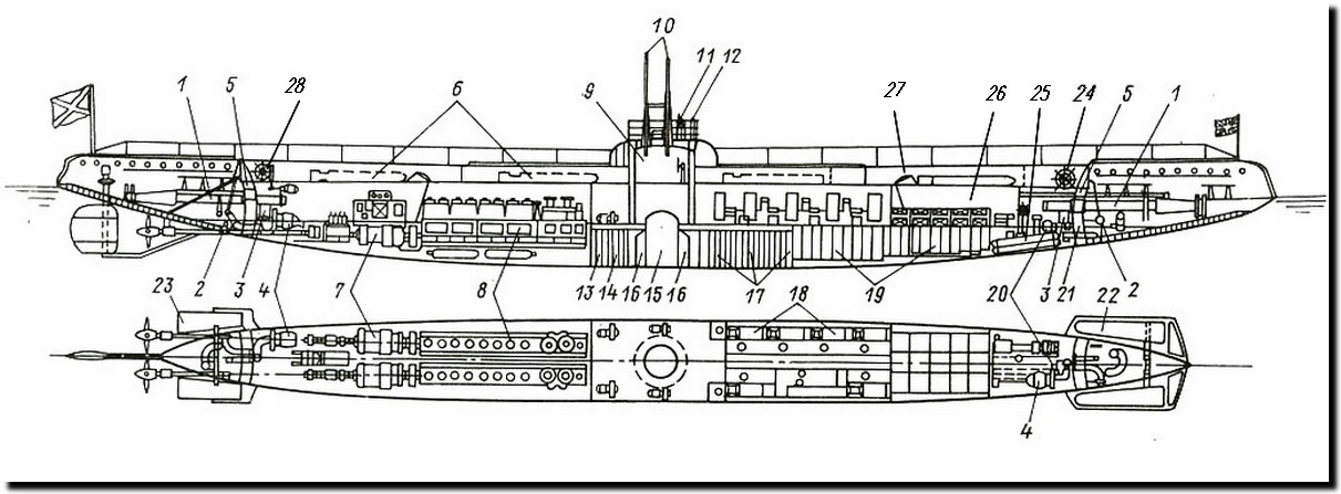 1.- tubes lance-torpilles 2.- ancres avant et arrière 3.- caisses de compensation des ancres 4.- pompe centrifuge 5.- caisses d'assiette 6.- niches des appareils Dzerwiecki 7.- moteur électrique principal 8.- moteur Diesel 9.- kiosque 10.- périscopes 11.- barre du gouvernail 12.- habitacle du compas 13. caisse à huile 14.- caisse de compensation 15 et 16.- caisse de réglage 17.-caisses à carburant 18.- locaux vie officiers 19.- batteries 20.- compresseur 21.- caisse à eau douce 22.- barre de plongée avant 23.- barre de plongée arrière 24.- commande barres de plongée avant 25.- bouteilles d'air comprimé 26-.- locaux équipage 27.- panneau de chargement torpilles avant 28.- commande barres de plongée arrière |