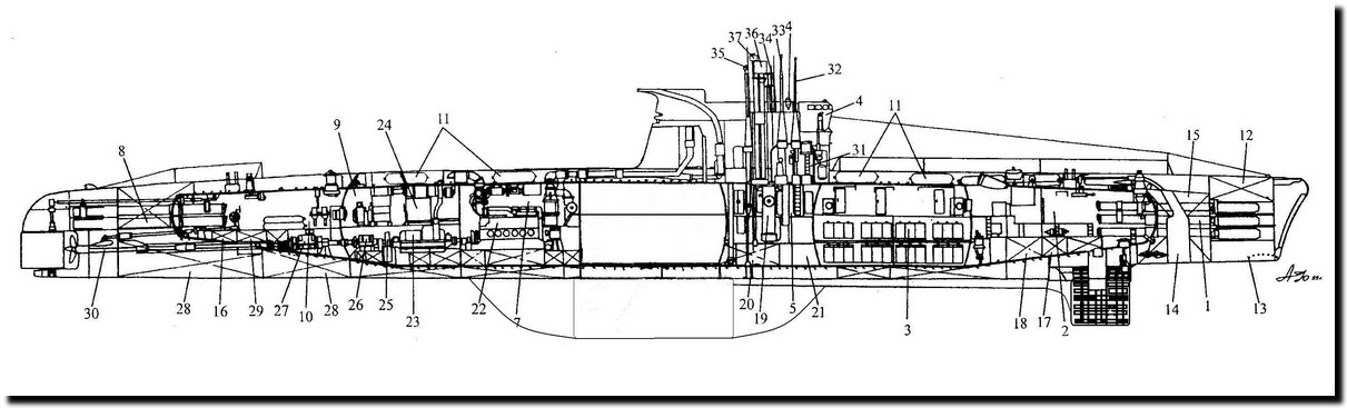 1- tubes lance-torpilles avant 2- tranche 1 3- tranche 2 (accumulateurs et locaux vie) 4- répétiteur du gyrocompas 5- 3ème tranche (central) 6- 4ème tranche 7- 5ème tranche (moteurs Diesel) 8- tubes lance-torpilles arrière