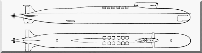 - le projet 955 prévu pour l'emport de 12 RSM-56 SS-N-30, et qui, innovation importante dans le domaine des sous-marins stratégiques russes, ne comporte qu'une ligne d'arbre. Le croquis ci-dessous en montre une esquisse avec une double hélice co-axiale.
