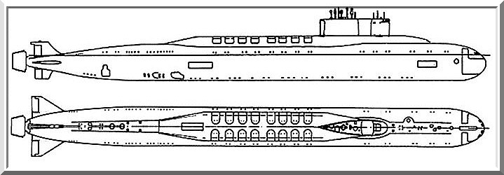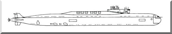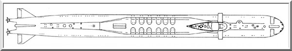 - le projet 955A, évolution du précédent pour l'emport de 16 missiles R-39M / RSM-56. Le croquis ci-dessous n'est pas fidèle au niveau du massif connu, mais il présente 16 tubes et une hélice pompe (ou carénée).