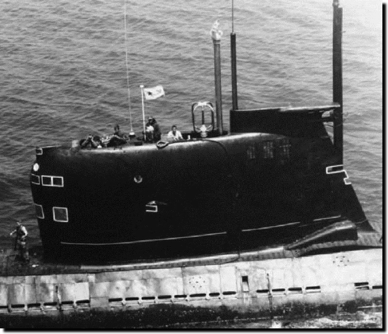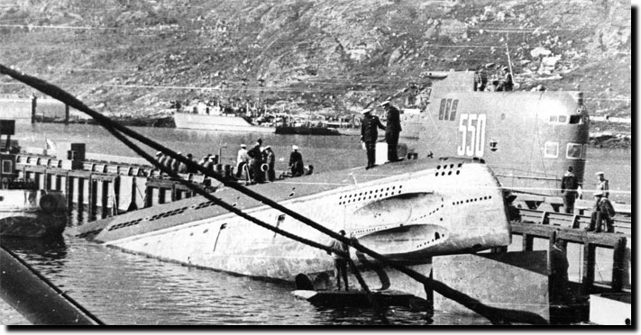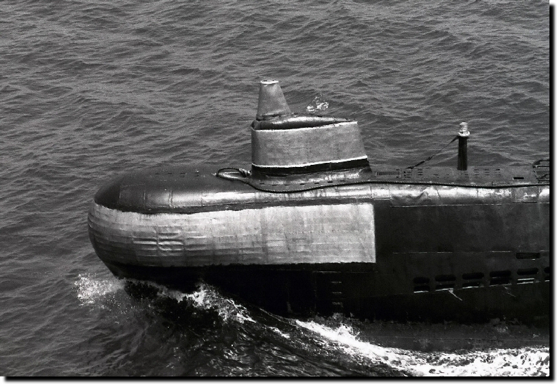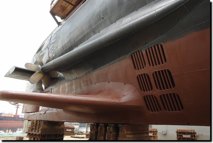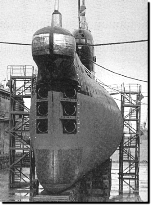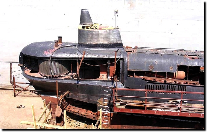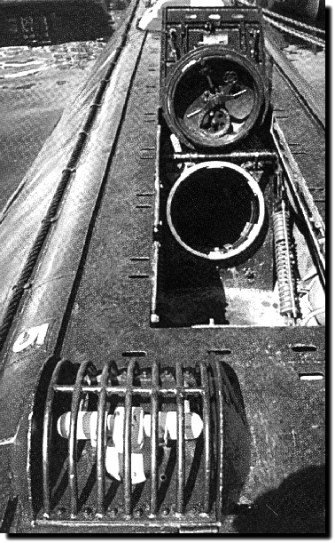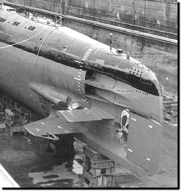 On notera les tubes lance-torpilles ouverts, les safrans de gouvernail et de barres de plongée placés derrière les hélices.