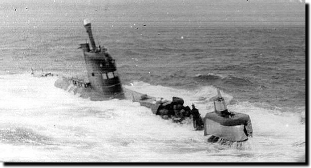 Le schnorchel a été sorti en surface pour alimenter les Diesel en air, du fait de la hauteur des vagues