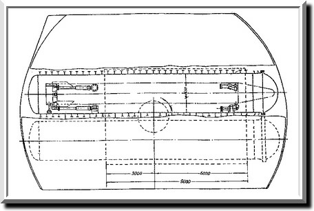 Sous-marin vu en coupe au niveau d'un ensemble de tubes érectiles (Les tubes sont représentés dans les deux positions) |
