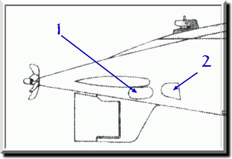 La grille d'éjection de l'eau des moteurs-pompes enchâssés (l'orifice d'admission est fermé, et l'on peut deviner son opercule à l'aplomb du coffret électrique blanc)