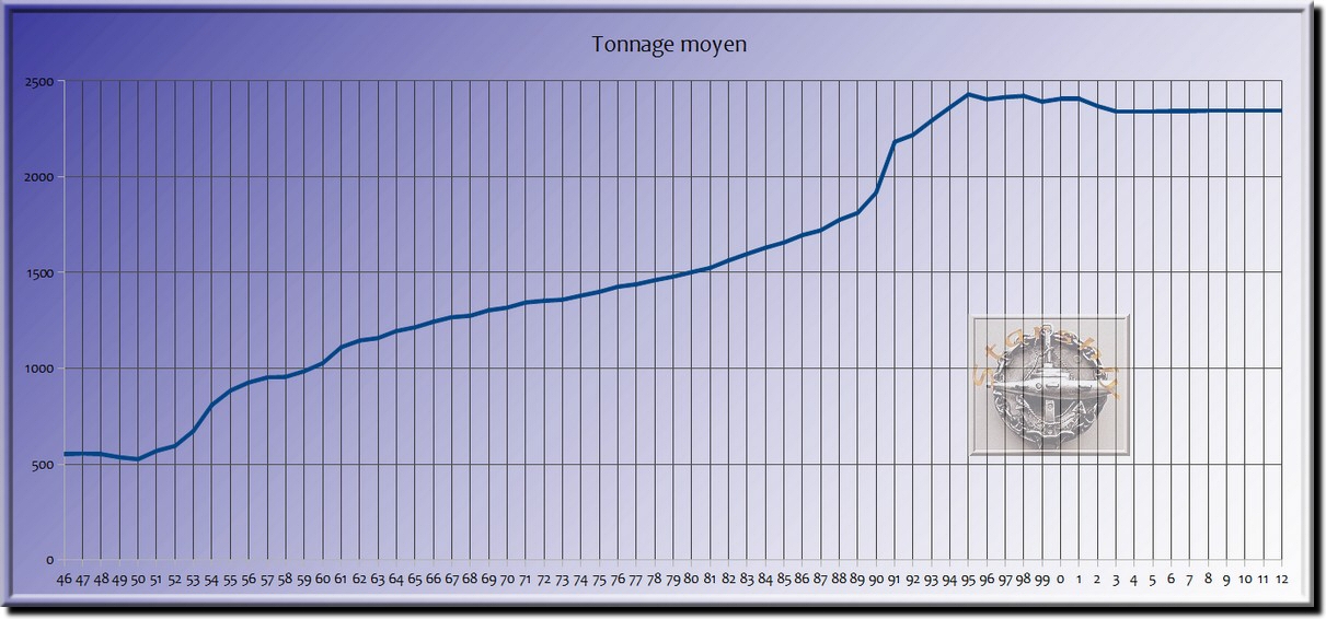 Pendant cette période, le tonnage moyen (ratio tonnage total sur le nombre d'unités), croit de manière régulière entre 1950 et 1989. Il dépasse les 1000 tonnes vers 1960, 1500 en 1980 pour atteindre 2000 en 1991. Il atteint son apogée en 1995 avec 2431 tonnes. Il s'établit aujourd'hui à 2346 tonnes.