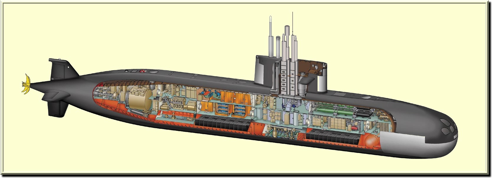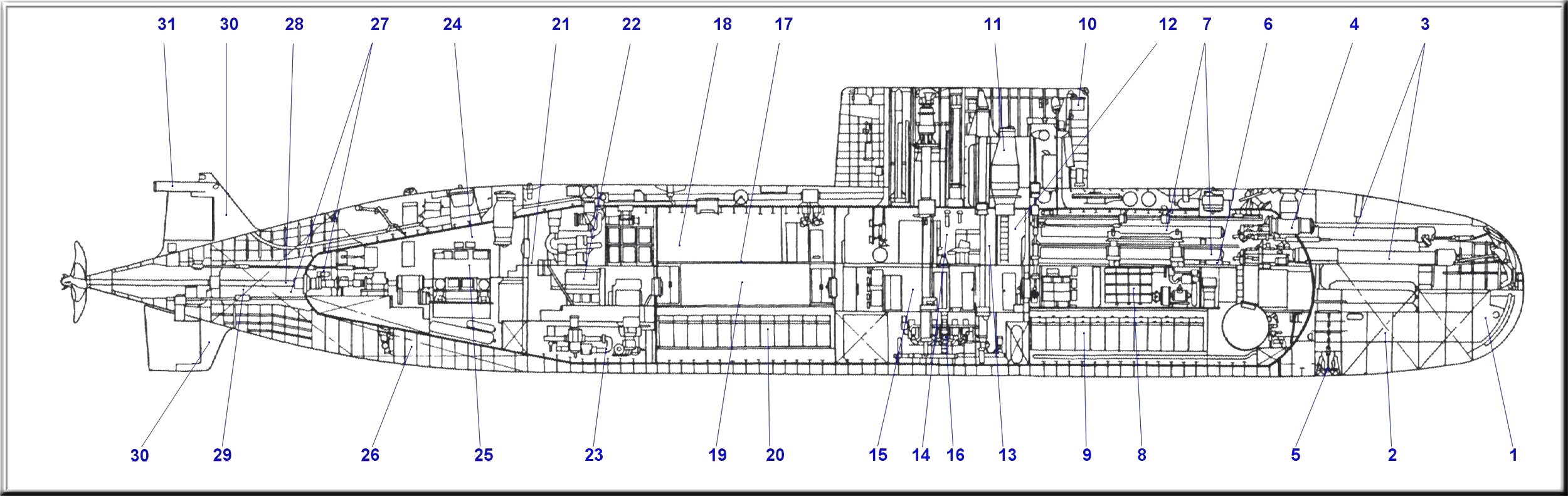 1- Base du sonar 2- Ballast avant 3- Tubes lance-torpilles de 533 mm 4- Panneau de chargement torpilles 5- Ancre 6- Tranche avant (torpilles) 7- Torpilles de réserve avec système de rechargement rapide 8- Auxiliaires 9- Batterie avant 10- Baignoire 11- Sas 12- Deuxième tranche (Central) 13- Central 14- Centre opérations 15- Équipements électroniques 16- Local auxiliaires 17- Troisième tranche (locaux vie et batterie) 18 et 19 - Locaux vie et infirmerie 20- Batterie arrière 21- Quatrième tranche (Diesels générateurs) 22- Diesel générateur 23- Auxiliaires 24- Cinquième tranche (Moteur électrique) 25- MEP 26- Caisse à combustible 27- Presses du gouvernail et des barres de plongée arrières 28- Ligne d'arbre 29- Ballast arrière 30- Stabilisateur vertical arrière 31- Tube de la flûte ETBF |