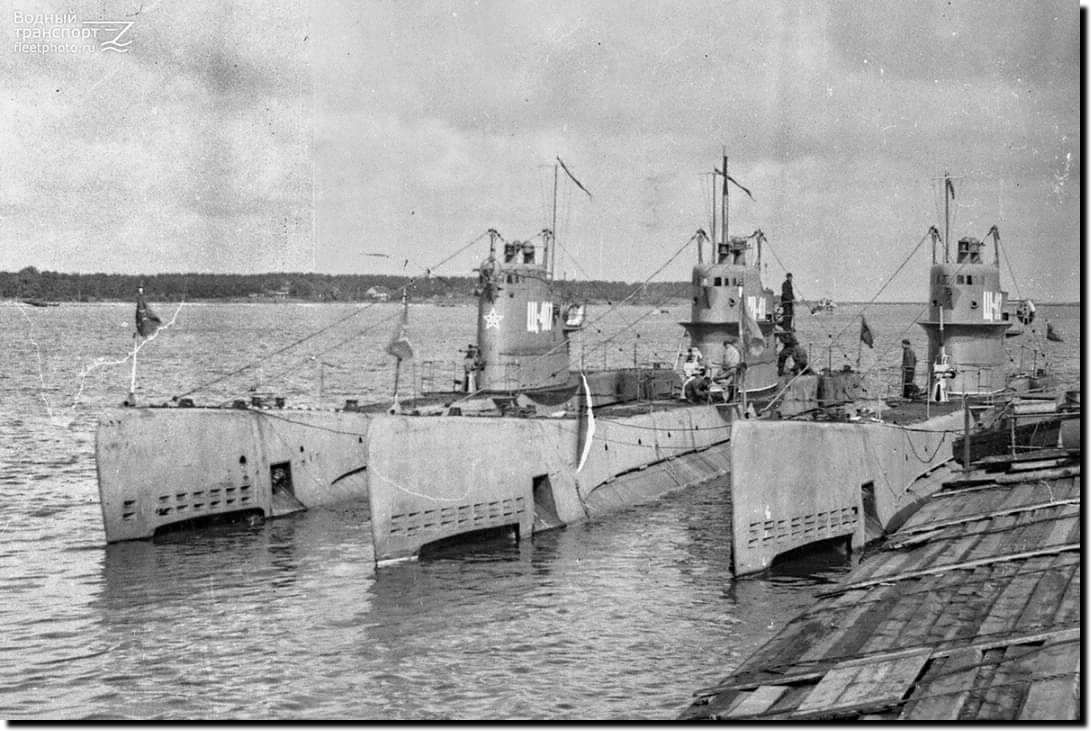 Les Shch-407, 411 et 412 de gauche à droite à quai à Liepaja entre juin 1946 et 1948