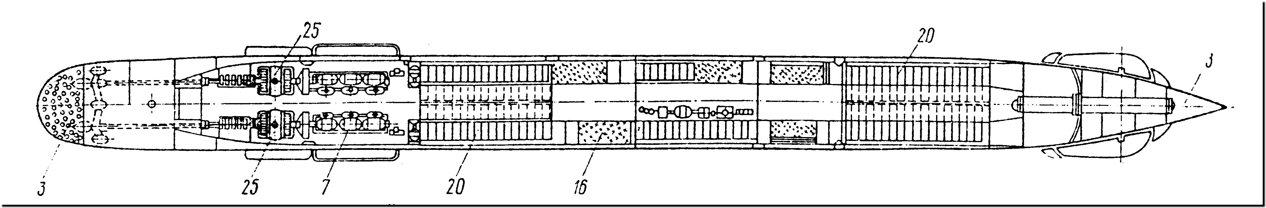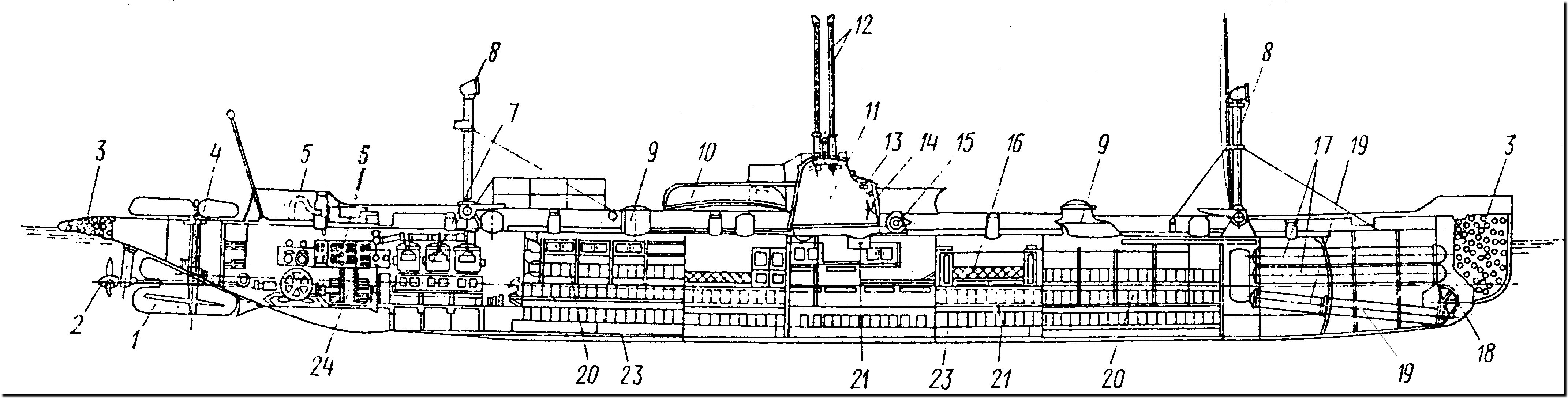 1- safran du gouvernail 2.- hélice 3.- liège de remplissage 4.- mèche du gouvernail 5.- tube d'échappement des gaz 6.- panneau électrique principal 7.- moteur à essence 8.- tube de ventilation 9.- panneau d'accès 10.- Embarcation 11.- kiosque 12.- périscopes 13.- hublot blindé 14.- barre du gouvernail 15.- tambour du gouvernail 16.- locaux vie équipage 17.- tubes de stockage des torpilles de réserve 18.- panneau des tubes lance-torpilles 19.- tube lance-torpilles 20.- batteries 21.- caisse de ballast interne 22.- caisse de ballast externe 23.- quilles de renfort 24.- panneau de commande des purges et vannes 25- moteurs électriques |