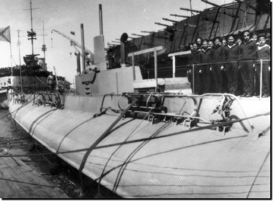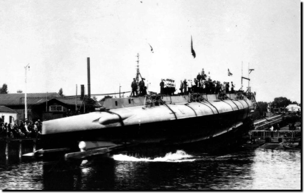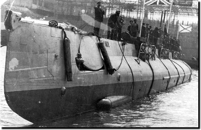 On voit bien l'extrémité arrondie du tube lance torpilles arrière tribord