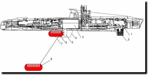 1- tubes lance-torpilles avant 2- tranche 1 3- tranche 2 (accumulateurs et locaux vie) 4- répétiteur du gyrocompas 5- 3ème tranche (central) 6- 4ème tranche 7- 5ème tranche (moteurs Diesel) 8- tubes lance-torpilles arrière