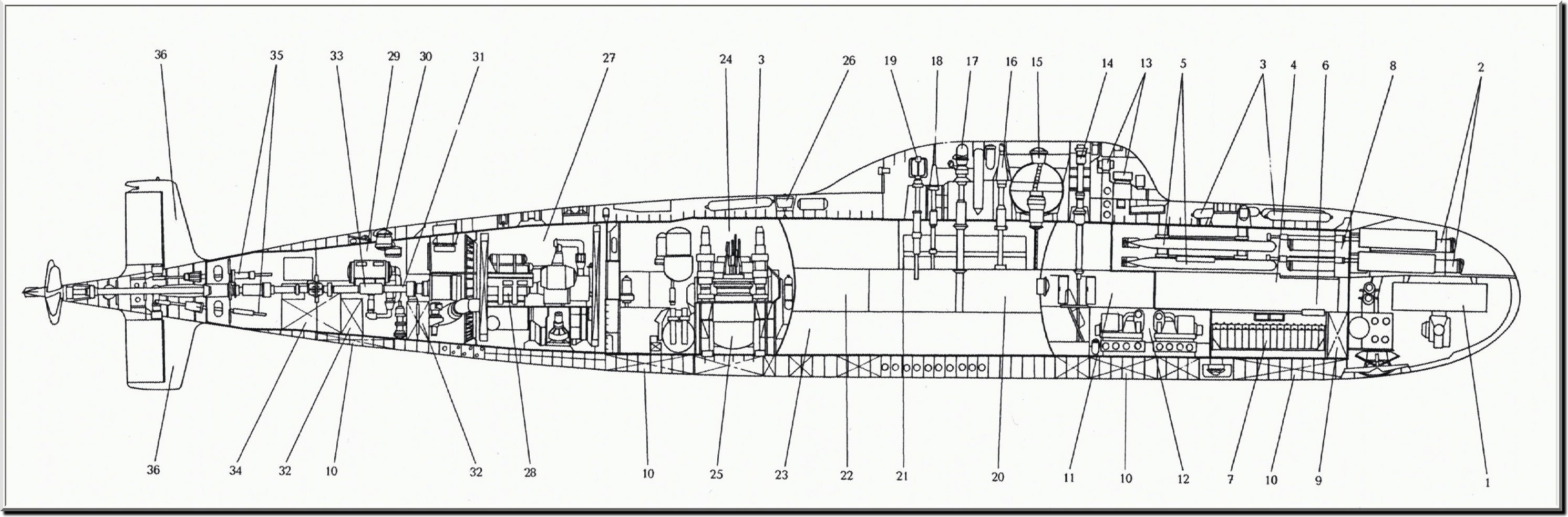 10. Ballast principal 11. Deuxième tranche (appareils électroniques et auxiliaires) 12. Ensemble des compresseurs d'air HP 13. Antennes du sonar Enisseï