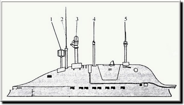 1. Antenne cadre du radio goniomètre VESLO-P 2. Antenne TOPOL 3. Antenne du radar MRK-55 CHIBIS 4. Périscope 5. Schnorchel avec antenne AIVA |