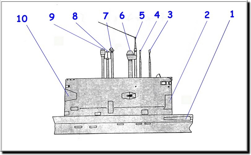 1-Barres de plongée avant rétractables 2. Émetteur du sonar MGK-400 3. Périscope d'attaque PK-8,5 4. Périscope de veille PZNG-8M 5. Antenne KIPARIS 6. Schnorchel 7. Radar de veille surface MRK-50 KASKAD 8. Cadre du radiogoniomètre ZAVESA 9. Intercepteur GE MRP-25 10. Senseur arrière du sonar |