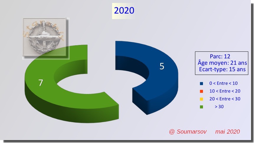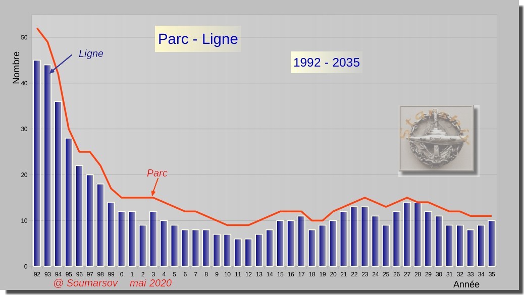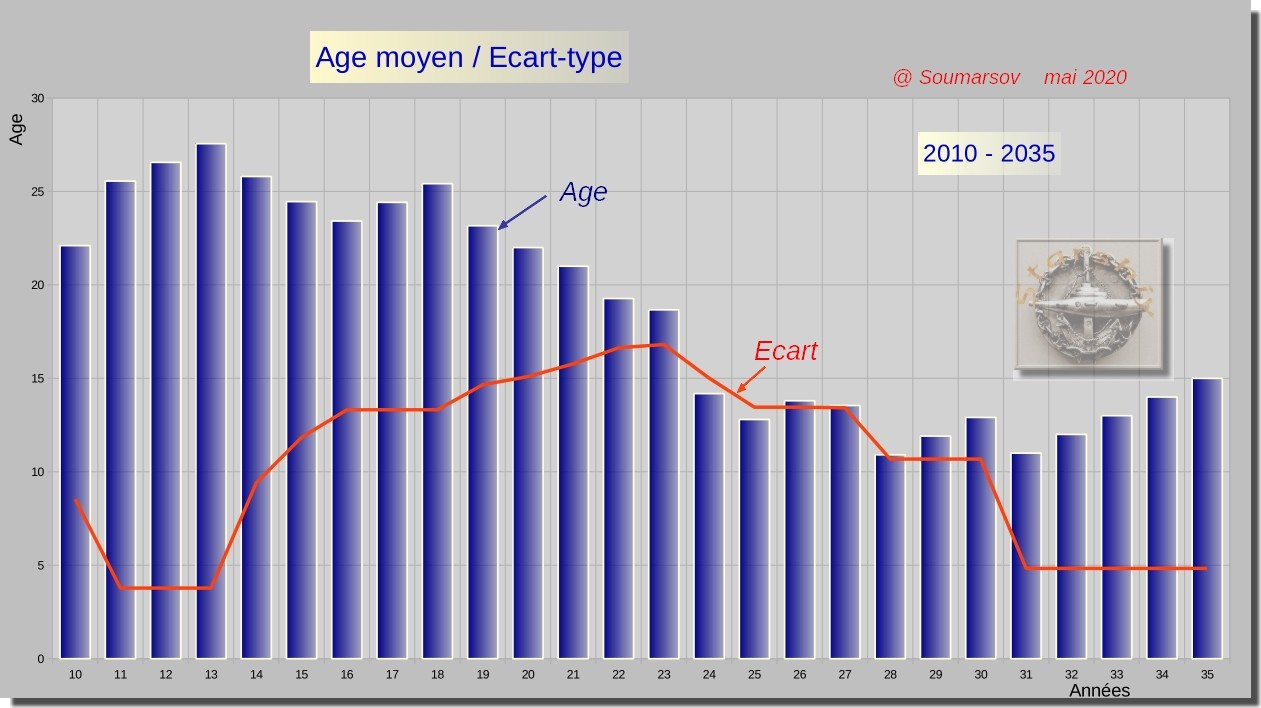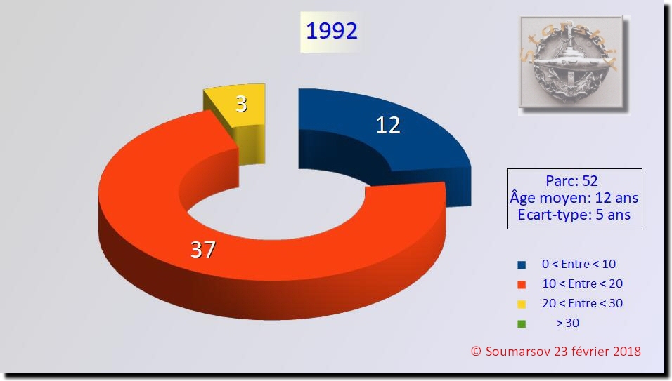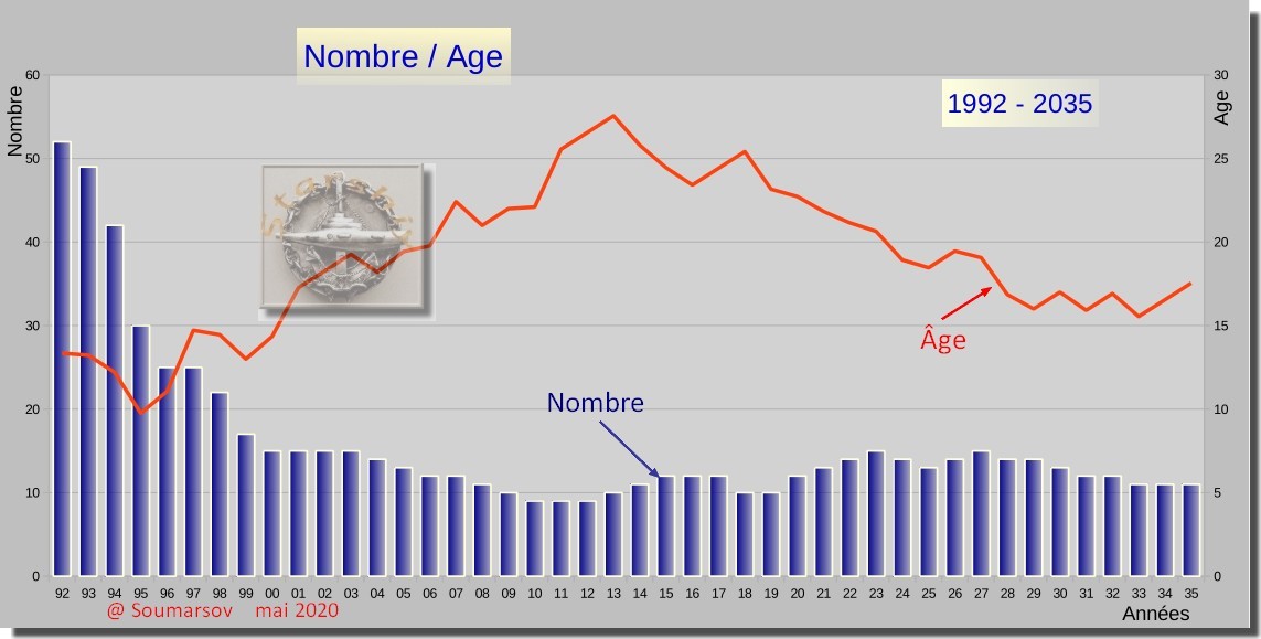 Le constat est sans appel : le parc est réduit à moins d’un quart du précédent. De plus, il se compose d’un côté d’unités récentes, de l’autre d’unités dont l’âge a dépassé les 30 ans, limite théorique de fin de vie (la plus ancienne atteint 38 ans). L’âge moyen et l’écart type sont importants. Les deux tiers des sous-marins sont compris dans une fourchette allant de 6 à 36 ans.