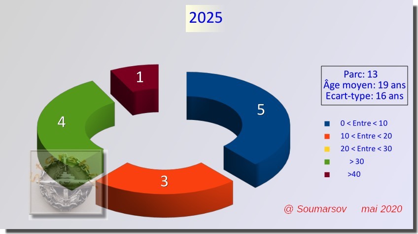 Par contre, l’âge moyen s’inscrit dans une plage entre 13 et 26 ans, maximum atteint en 2012. Il se maintient au-dessus de 20 ans de 2005 à 2021. Le vieillissement devrait atteindre son plus bas niveau en 2028. Mais, même avec l’arrivée des Borey-A n° 6 et 7, cet âge moyen restera supérieur à celui de la première moitié des années 90.