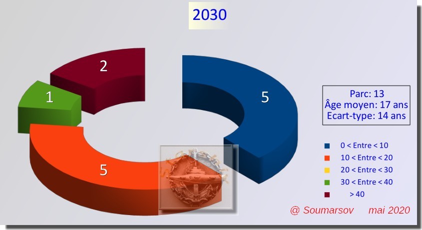 L’écart type atteint un pic en 2023, pour revenir à 5 ans à partir de 2031, du fait de l’homogénéité de la flotte. On analysera plus avant toutes ces données pour la période 2015 – 2040.